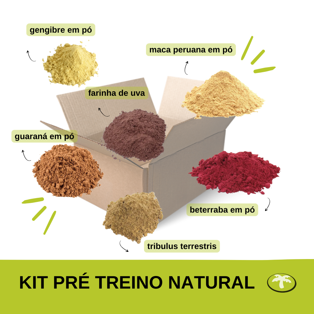 Esse kit com 7 itens é o pré treino 100% natural ideal pra dar mais energia e disposição para seu dia a dia ou para seus treinos.